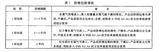 ①包裝的防銹等級(jí)應(yīng)根據(jù)產(chǎn)品的抗銹蝕能力、流通環(huán)境、包裝容器的結(jié)構(gòu)、包裝材料的一般性能等因素來(lái)確定,防銹包裝等級(jí)分為:1級(jí)包裝、2級(jí)包裝、3級(jí)包裝.詳見表1,
